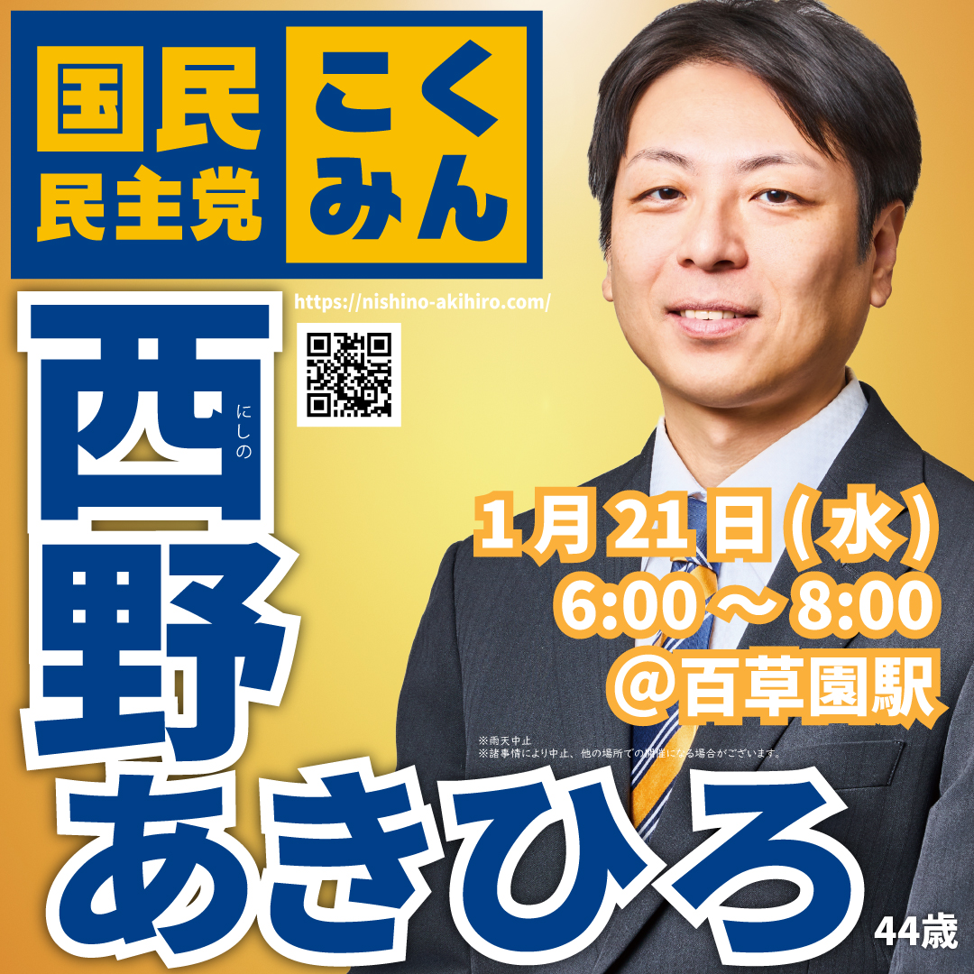 国民民主党 日野市政策委員 西野あきひろが、2026年1月21日(水)6:00~8:00、百草園駅にてご挨拶致します。 ※雨天中止 ※諸事情により中止、他の場所での開催になる場合がございます。 お知らせ よかったらシェアしてね! URLをコピーしました! 駅頭@平山城址公園駅 2026年1月22日(木)6:00~@南平駅 関連記事 1203票の付託 2026年2月16日 日野市の皆様へ 2026年2月13日 2026年2月14日(土)スケジュール 2026年2月13日 2026年2月13日(金)スケジュール 2026年2月12日 2026年2月12日(木)スケジュール 2026年2月11日 2026年2月11日(祝・水)スケジュール 2026年2月10日 2026年2月10(火)スケジュール 2026年2月10日 2026年2月9(月)18:00@高幡不動駅南口 2026年2月9日